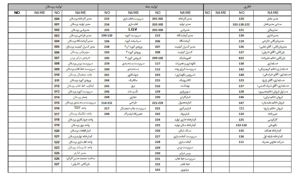 مدیر تولید 202 *** آماده سازی : 226-227 *** پرس : 229 ***خط لعاب 232*** کوره : 110*** بسته بندی : 239 ***LGV: 235